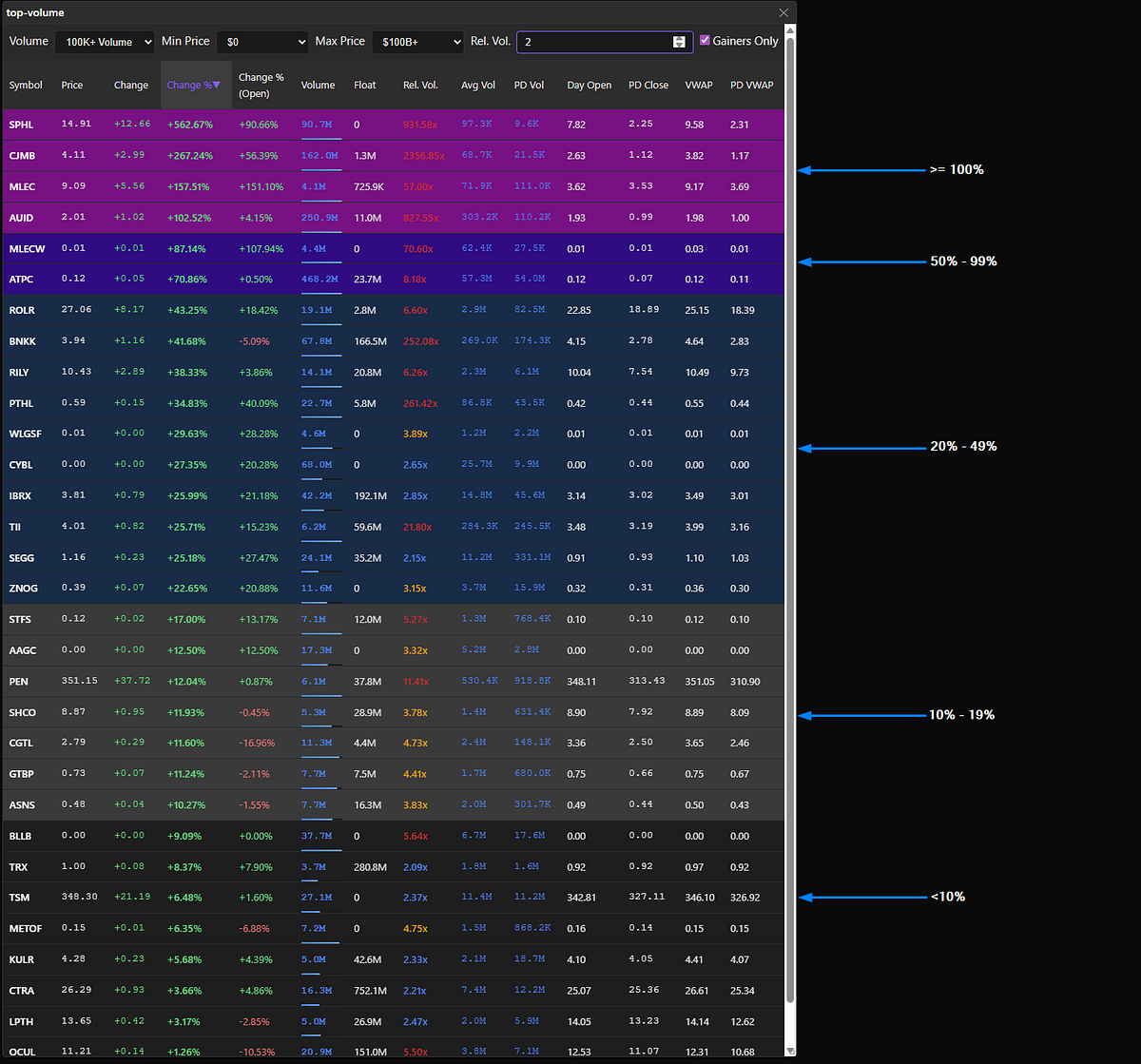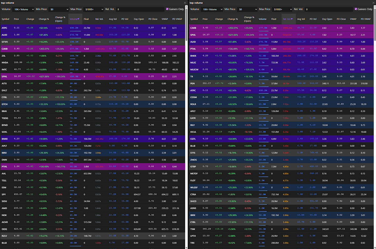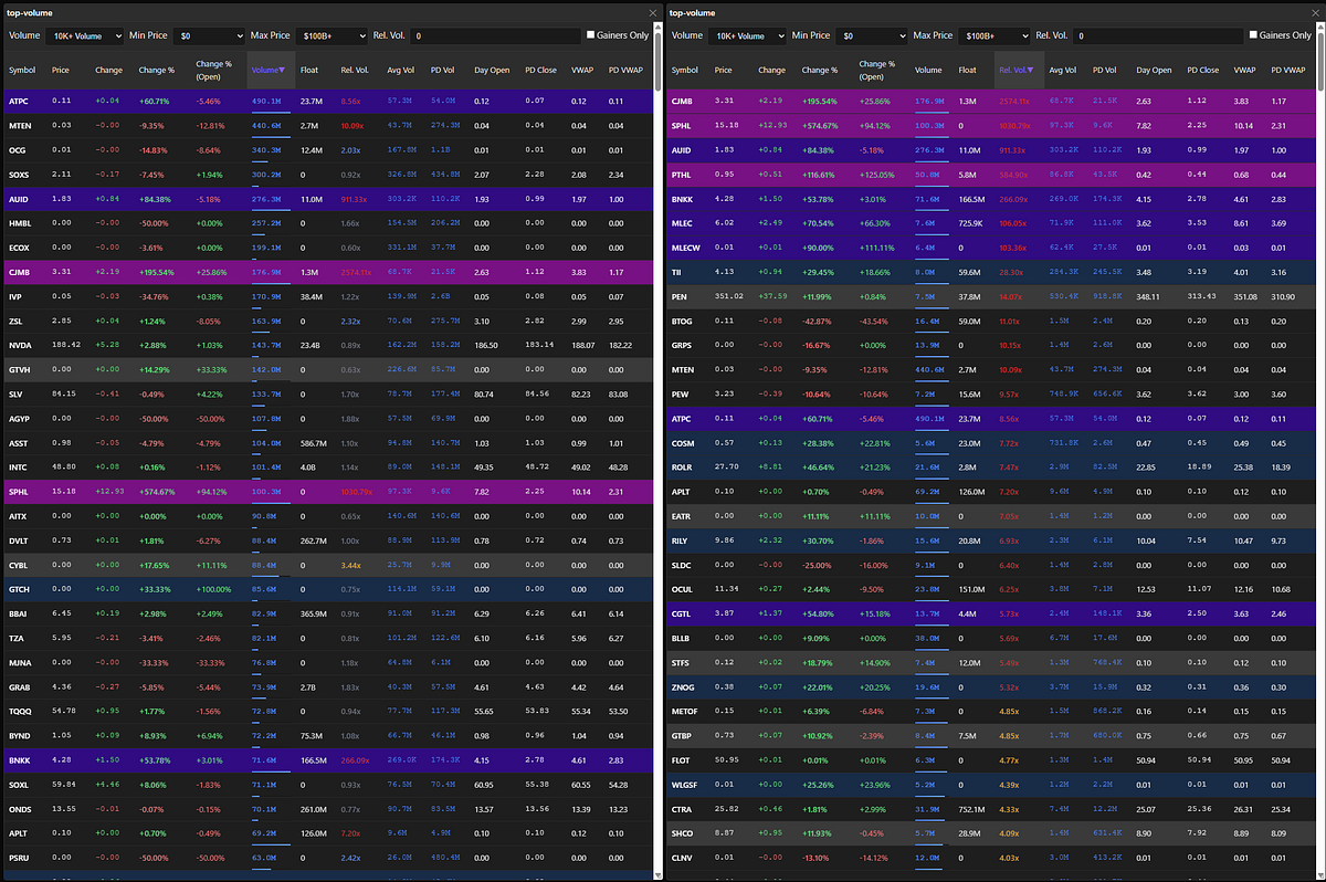 The idea here is to see where all the trading volume is going. The highest-volume stocks are going to be the “most obvious” stocks to trade — it’s where the entire market is focused. For example, SPY, NVDA, QQQ, and TSLA appear in the top 500 by volume every single day. But here’s where it gets interesting: CJMB normally gets 69K of volume per day but is now trading 176.9M shares on a 1.3M share float. That’s unusual. And look — it’s up 195% since yesterday’s close. Same thing with SPHL. Over 1,000x relative volume and up over 574%! Wow!