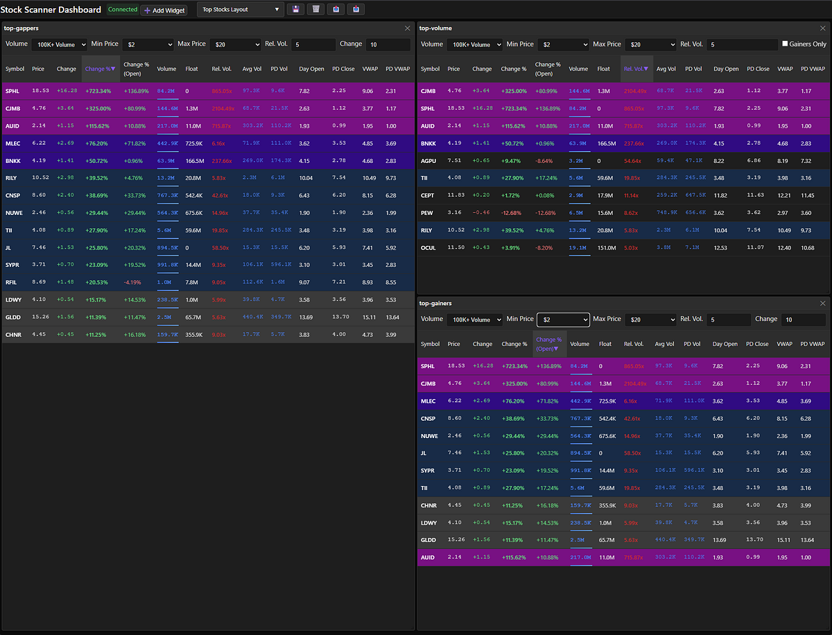 Stock Scanner Dashboard with the TopGappers, TopGainers, and TopVolume widgets displayed.