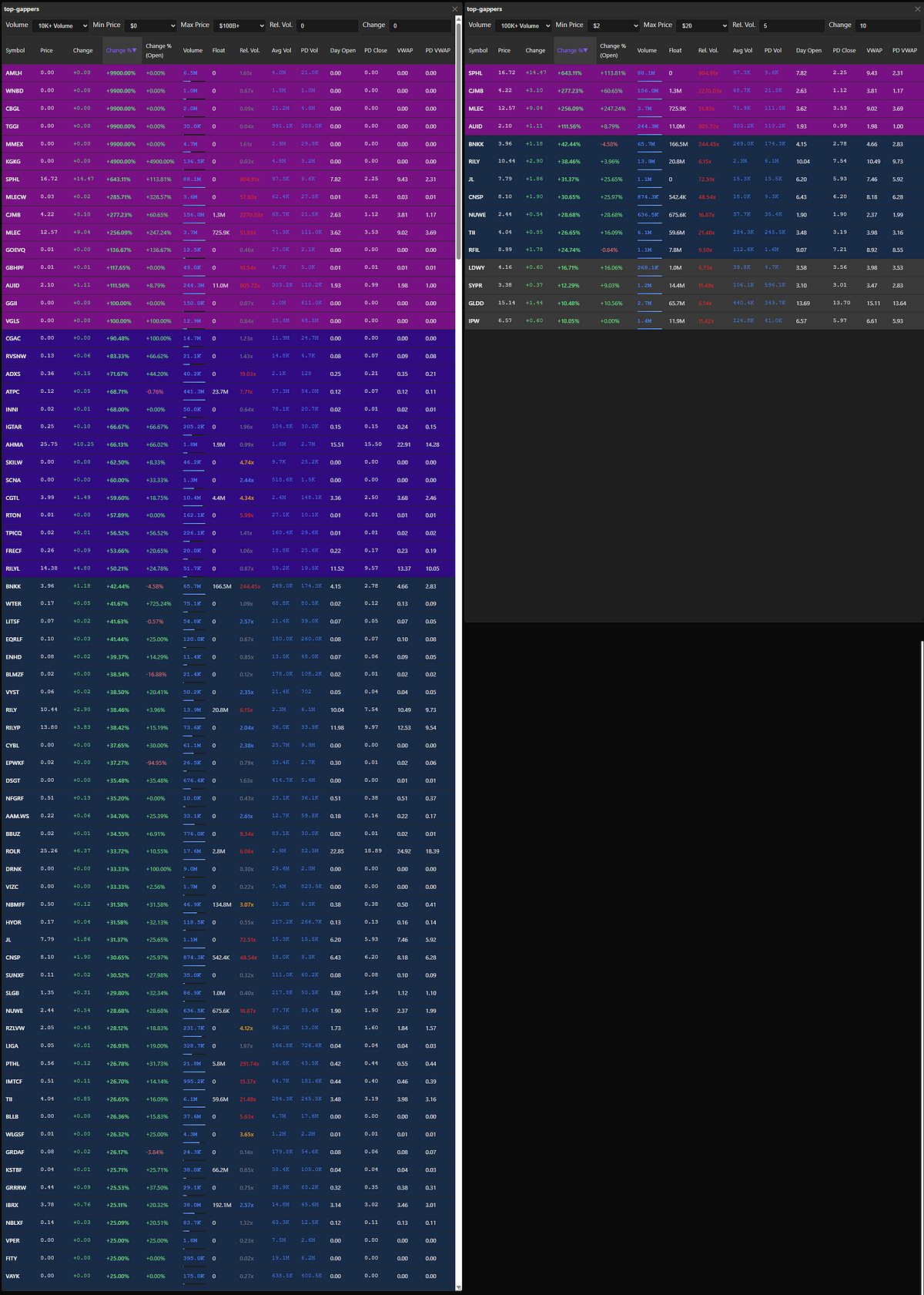 TopGappers side-by-side. Unfiltered view on the left. Default filters on the right.