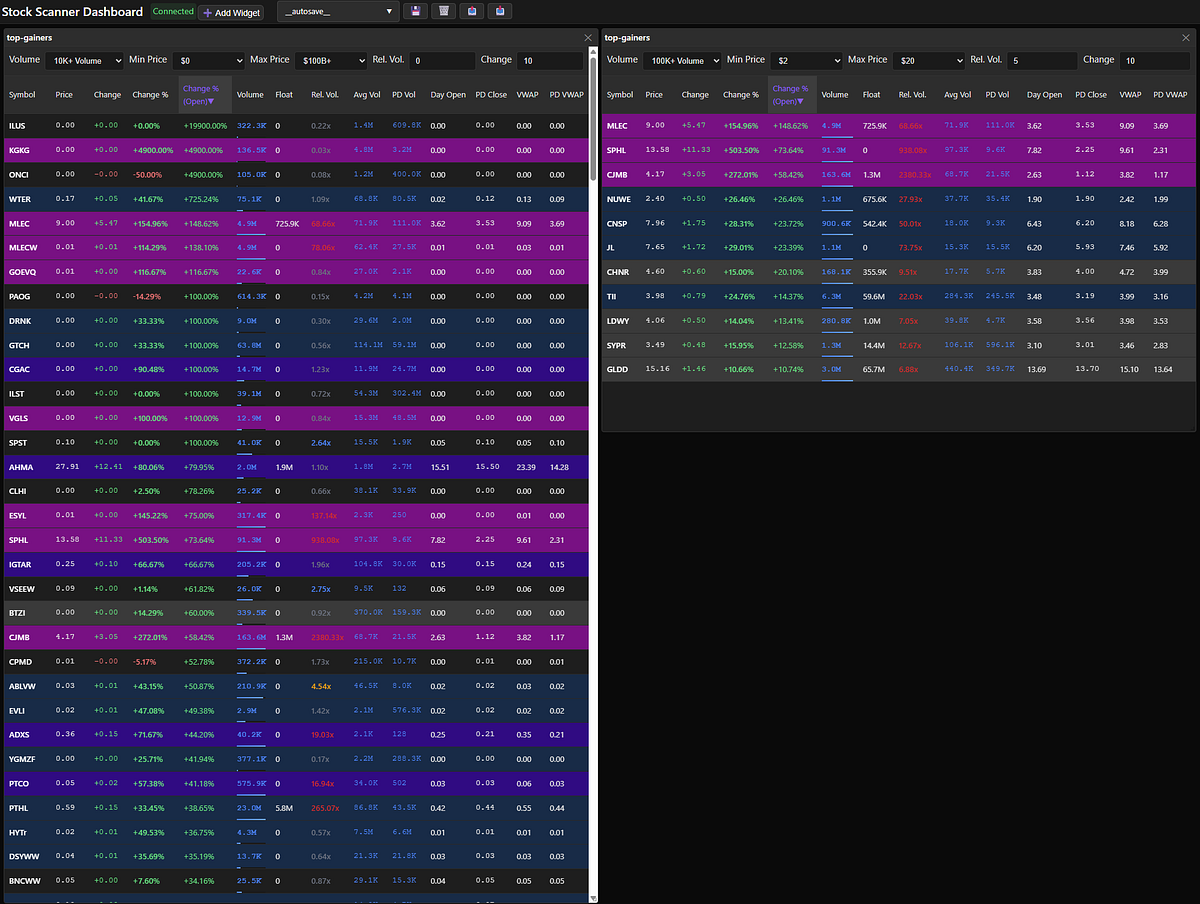 The widgets filter data by default to only show stocks that meet the Five Pillars criteria. (Currently, filtering works for price, percent change, relative volume, and total volume. Float is experimental, and news integration isn’t ready yet.) Stocks that don’t meet the criteria are filtered out, but you can adjust the filter controls to reveal the full top 500. The tables can be sorted by any column — simply click on a column heading to sort.