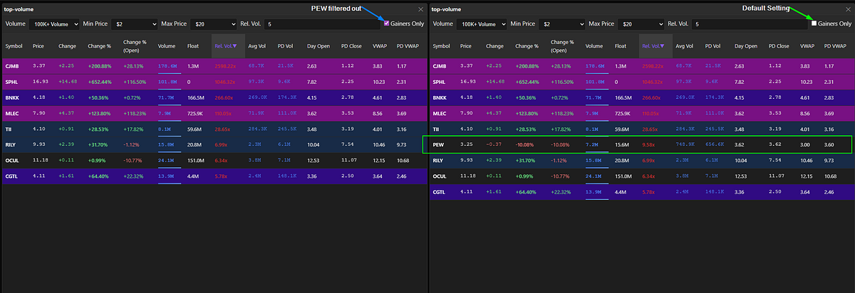 TopGainers side-by-side. Unfiltered view on the left. Default filters on the right.