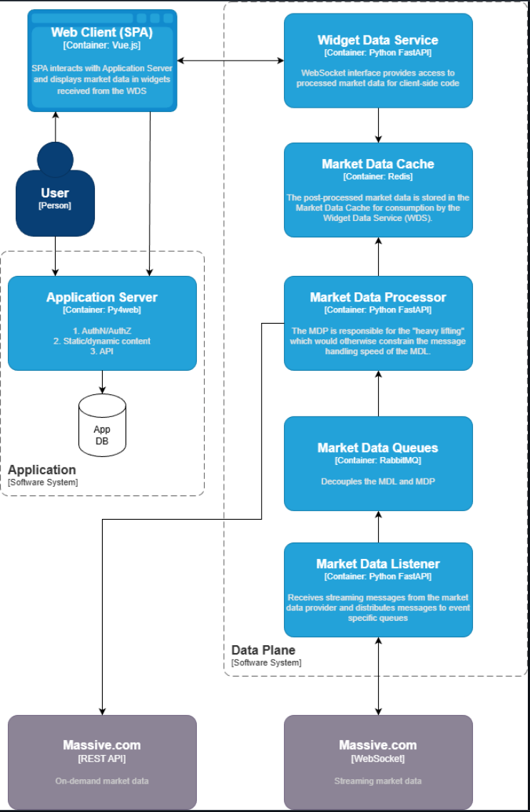 What I built is a whole different animal. This is not a single script or executable that you run on your PC. Rather, it consists of a Front-End Single Page Application (SPA) served via py4web and a microservices data plane for handling market data. Building and deploying a production-grade instance is a project in itself. Here’s the high-level architecture (with full deep-dives coming in future posts).