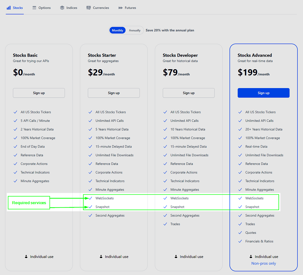 Pricing breakdown: The Stocks Starter is the cheapest plan with the required services (WebSockets and Snapshots). The Stocks Basic plan lacks WebSockets and Snapshots, which are both critical. The Market Data Listener connects via WebSocket, and the Market Data Processor calls the Snapshots API when processing market data.