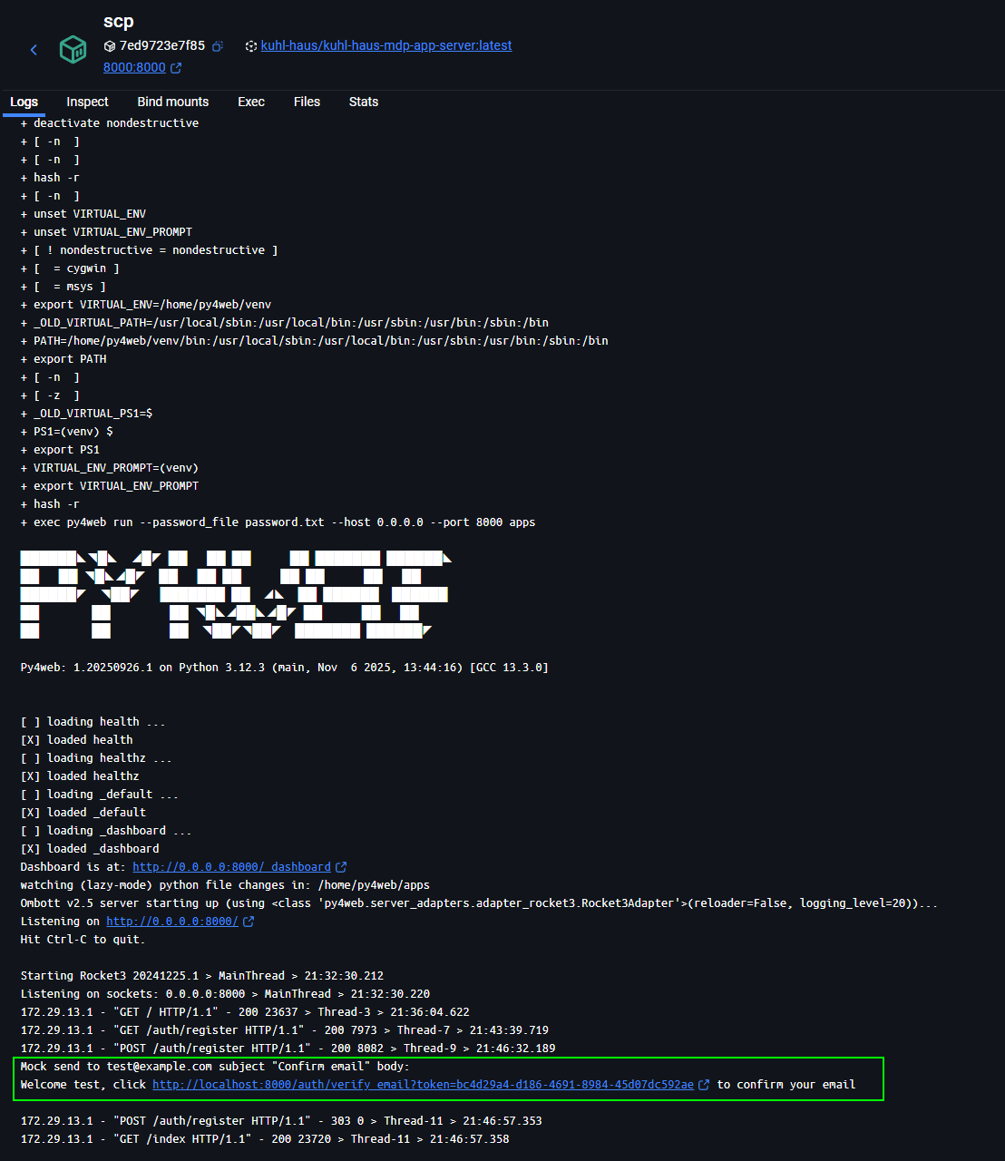 Check the container logs for the scp container and open the verification link in your browser.