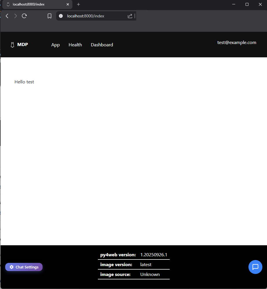 Health check URL emits JSON with the container image source, image version, health status, and Py4web version.