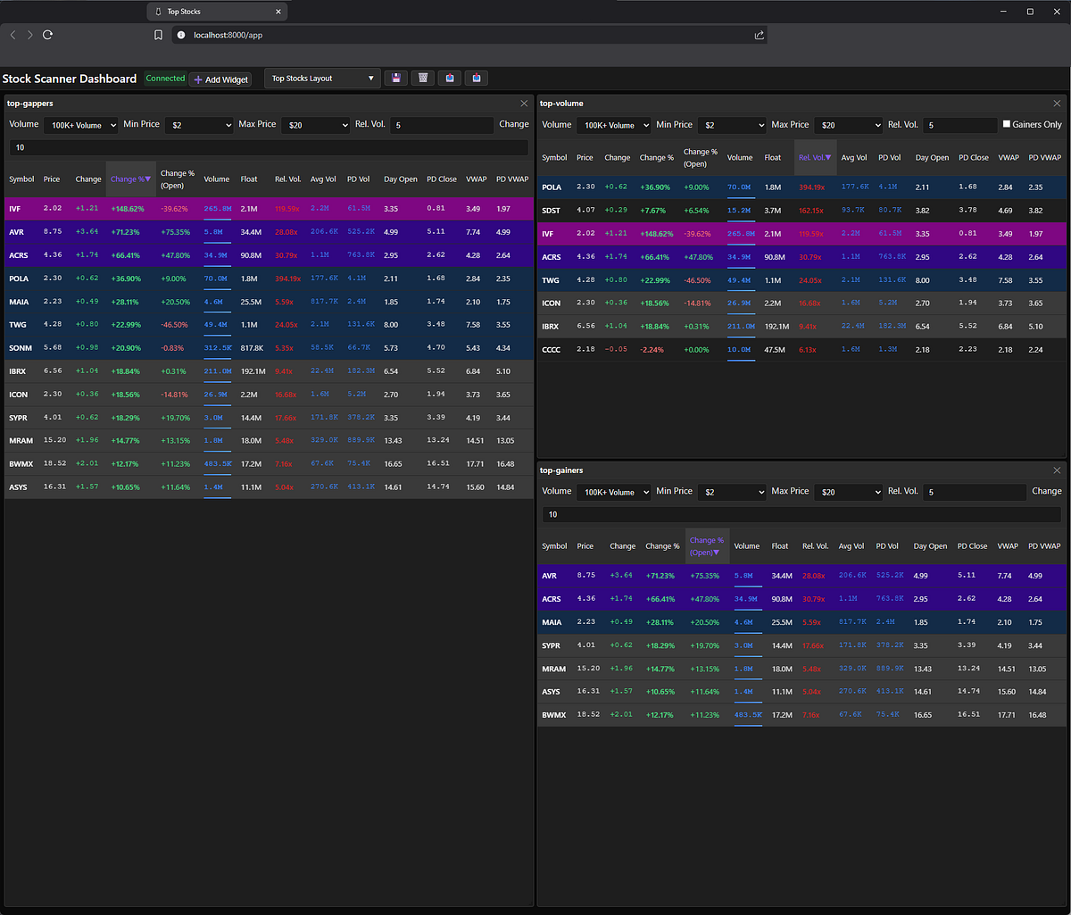 Launches the stock scanner — a Vue.js-based single-page application that displays market data via three drag-and-drop widgets: TopGainers, TopGappers, and TopVolume. I described these widgets in detail in Part 1 of this series.