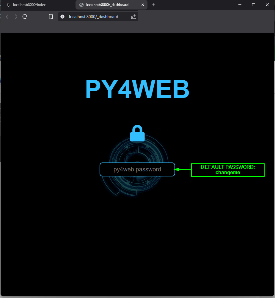 Screenshot: Dashboard login page — default password is ‘changeme’