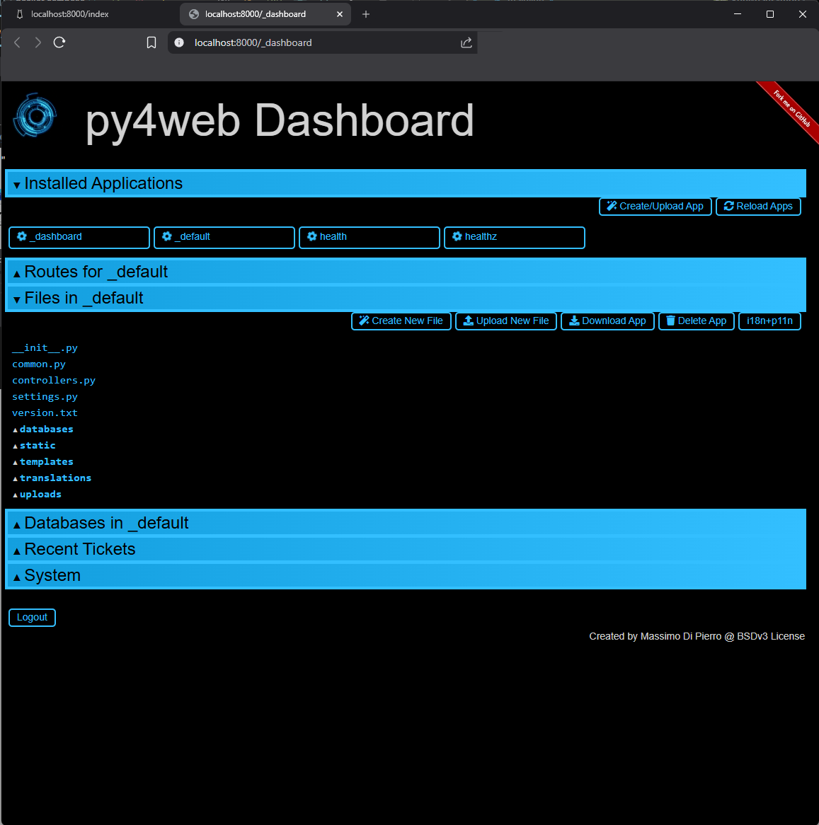 This the py4web dashboard. It’s used to manage applications and databases. More information is available in the py4web documentation.