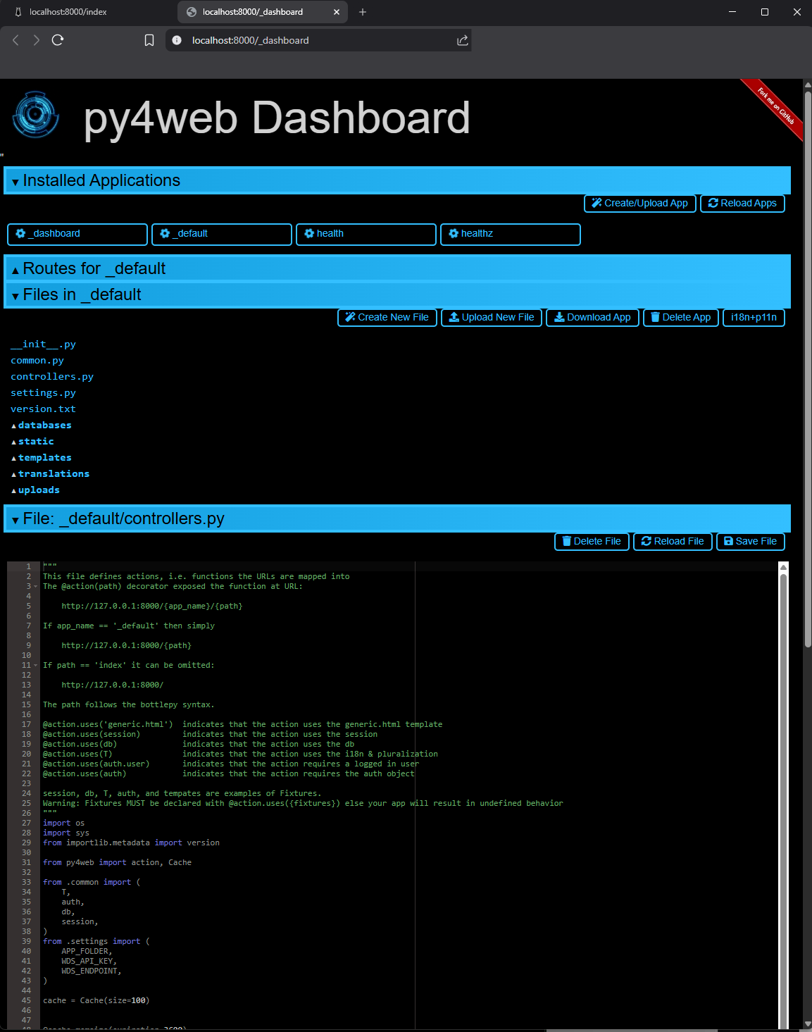 Screenshot: Dashboard displaying the contents of _default/controllers.py