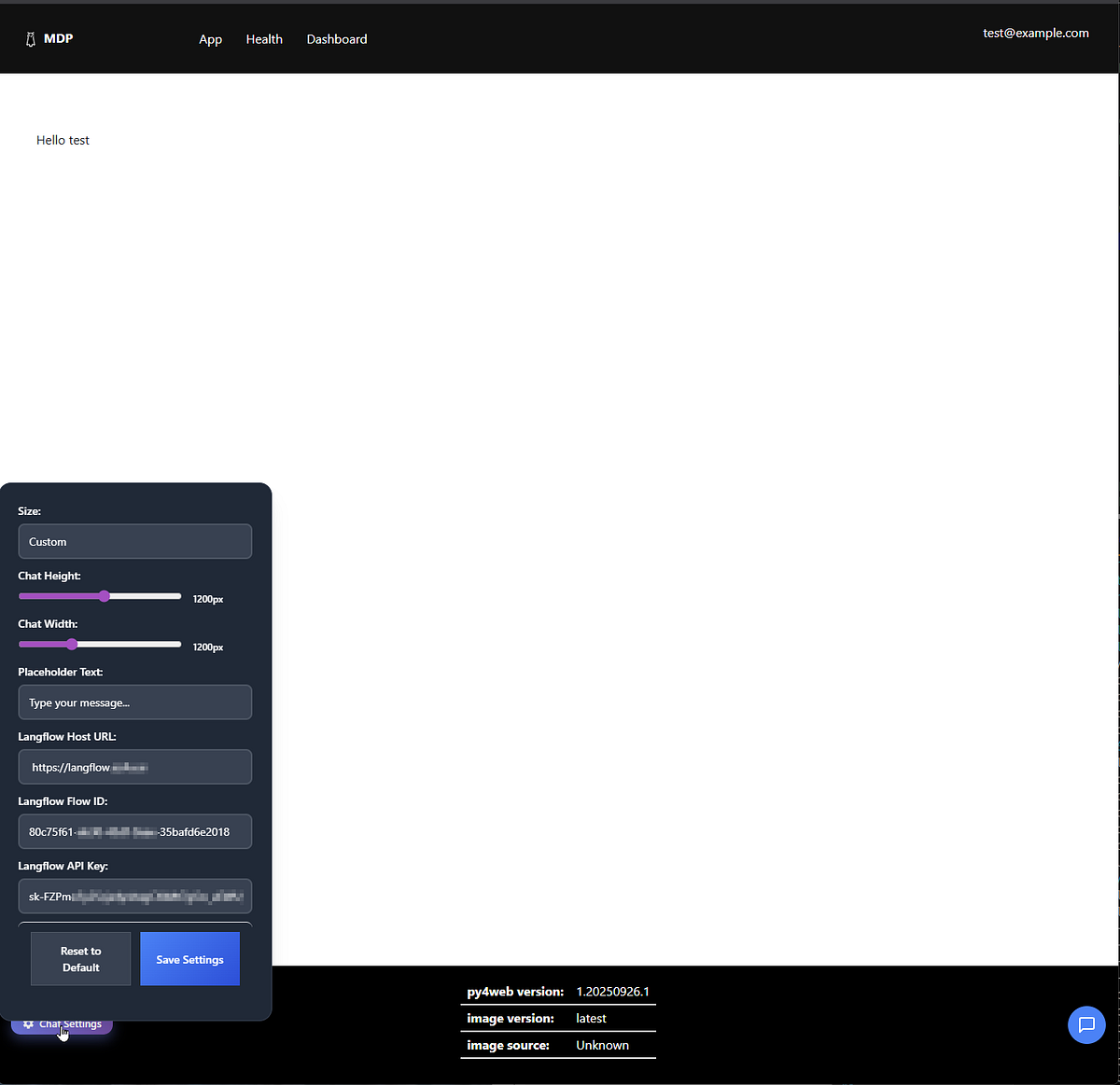 If you happen to have a Langflow instance, open the chat settings and enter the Langflow Host URL, Flow ID, and API key in the dialog, then click ‘Save Settings’.
