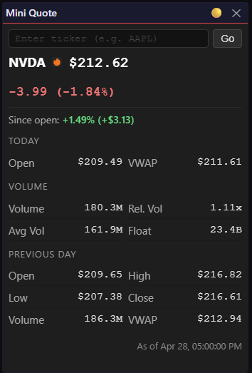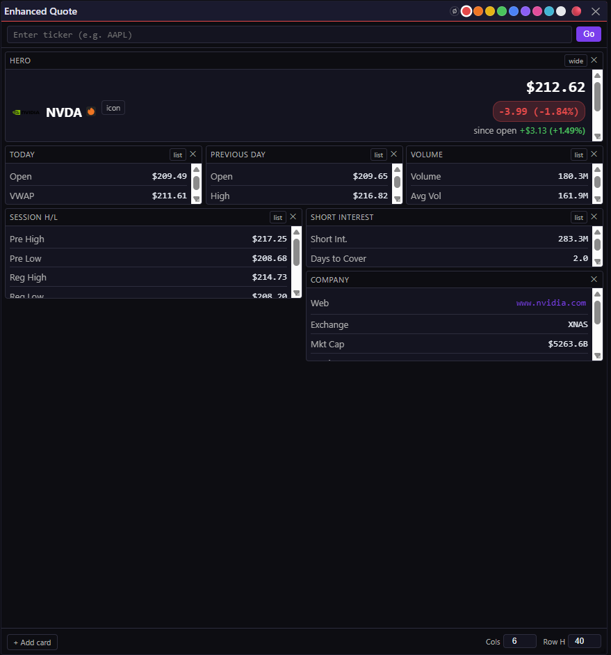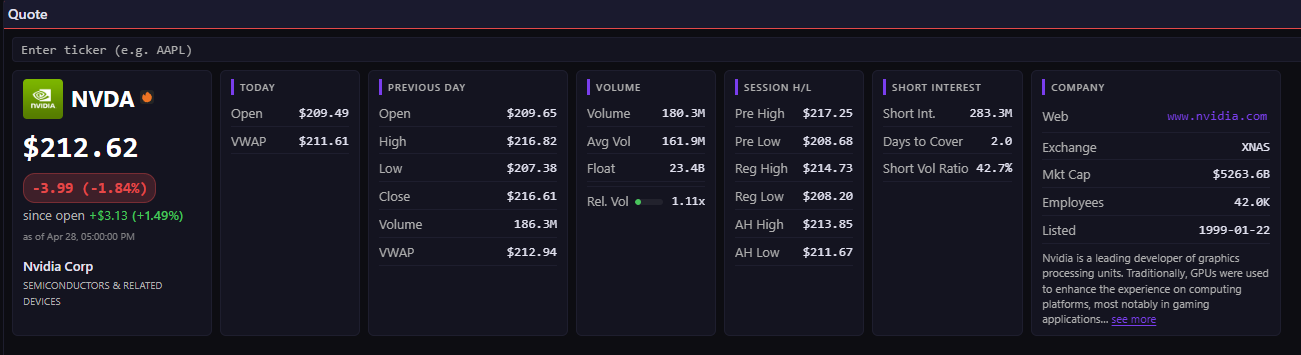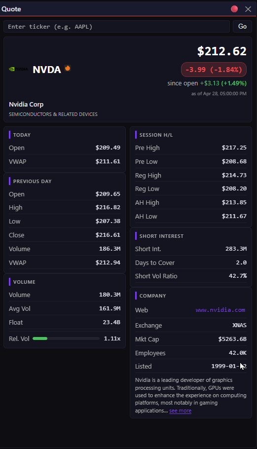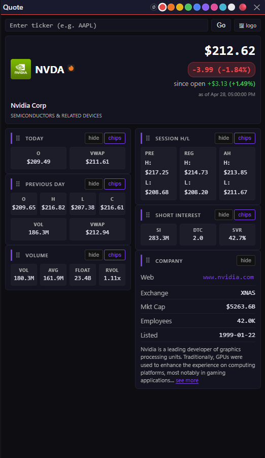 - A quote widget that tells me everything about a ticker without alt-tabbing to four browser tabs.
