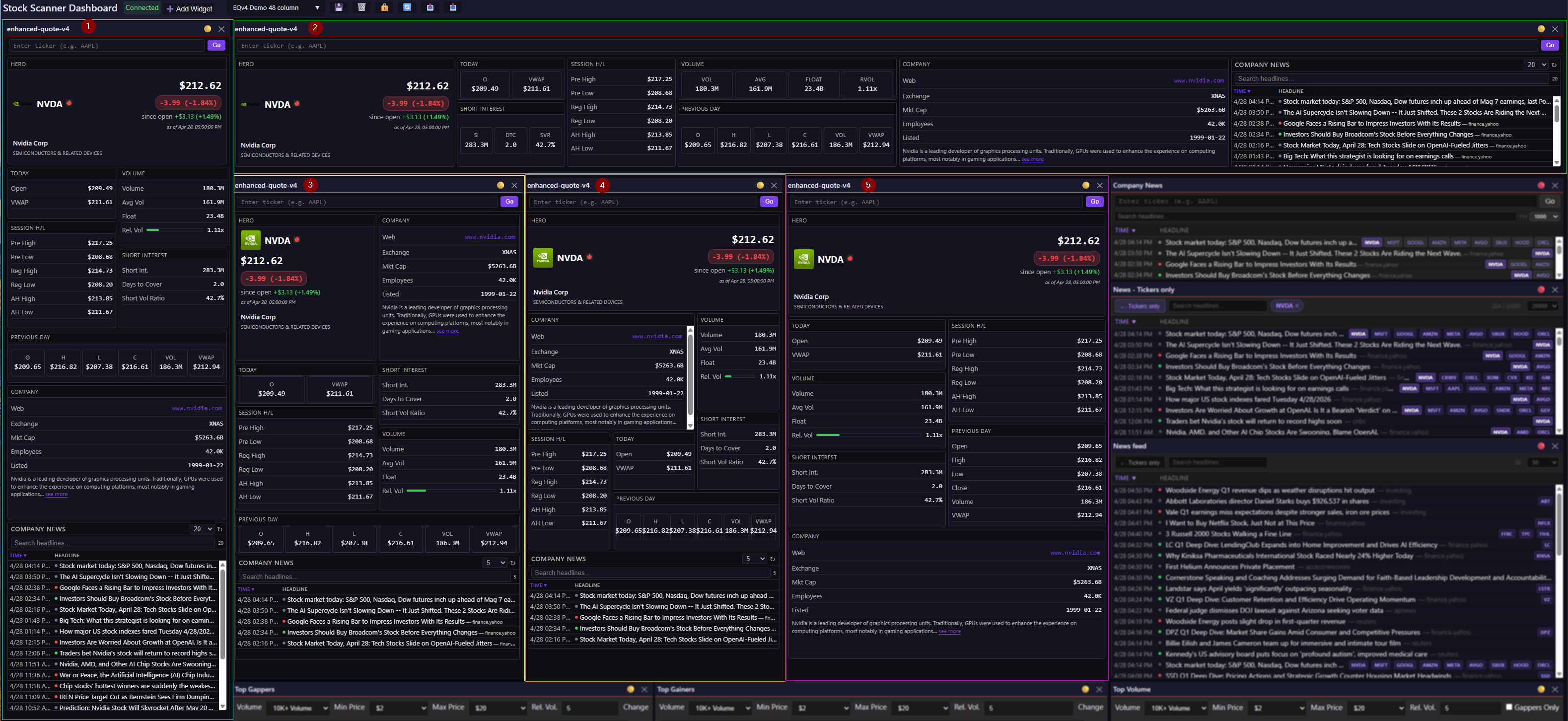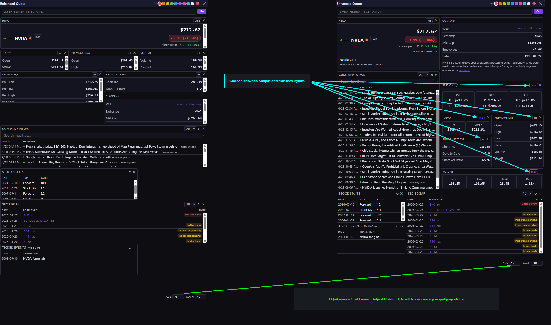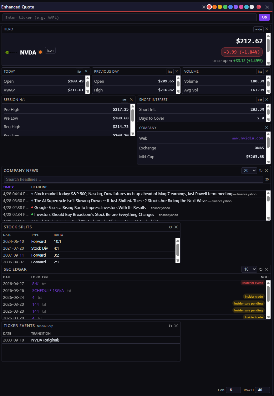 EQv4 (Enhanced Quote widget) — grid layout. All the EQv3 cards plus SEC EDGAR Index, Stock Splits, Ticker Events, and Company News. (EQv4 calls Finlight directly for the Company News card — it doesn’t go through the Widget Data Service like the standalone Company News widget does.)