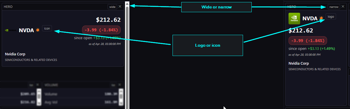 Screenshot: Hero card can choose between wide and narrow layouts as well as displaying the logo or icon.