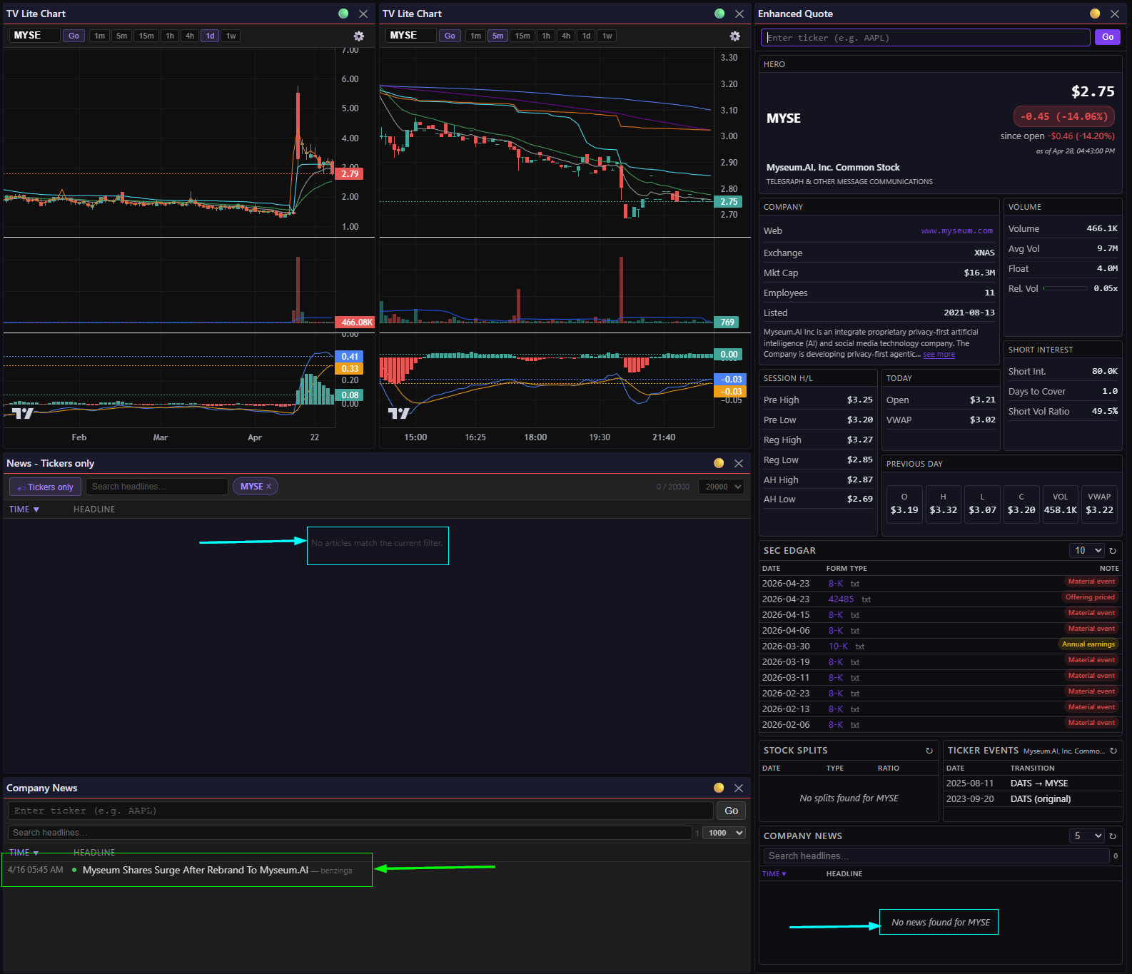 The Company News Widget gets news that is cached in the WDC after being processed by the Finlight Data Processor (FDP). In addition to caching articles that are tagged by Finlight, The FDP searches the title and summary for stock tickers and adds them to the Company News feed. In the case of the MYSE surge on 4/16/2026, Finlight didn’t tag the news article about their rebrading to Myseum.AI. However, the FDP caught it and added it to the Company News feed.