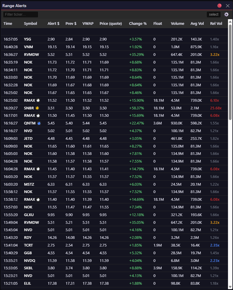 HOD/LOD alerts are noisy. Like, Saturn V rocket launch noisy. So this widget leans heavily on filters to surface only the tickers matching your criteria, and those settings persist with your layout. Drop it in HOD or LOD mode, wire it to the event bus, and clicking a row lights up that ticker across every linked widget on the dashboard. Flip on “filter” mode and the Range Alerts widget itself collapses down to just that ticker too — which makes it easy to spot when a ticker has successively breached previous HOD or LOD thresholds.