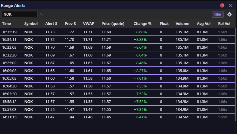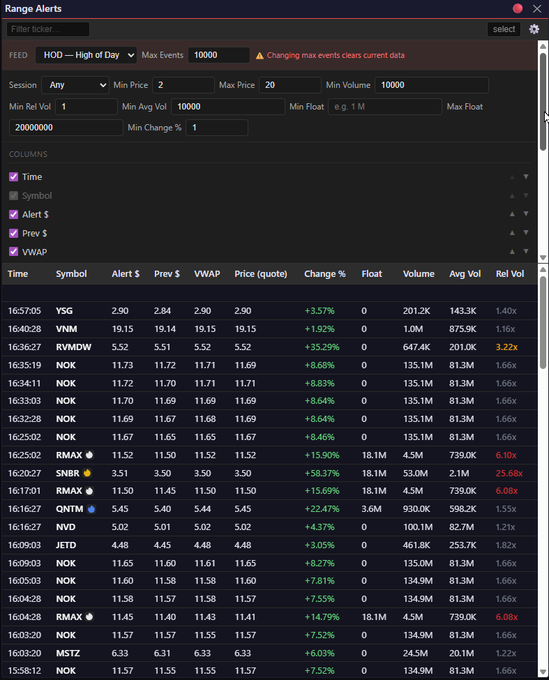 Screenshot: Range alerts widget settings for day trading: $2-$20, 20M max float, 1x rel vol, 1% min change
