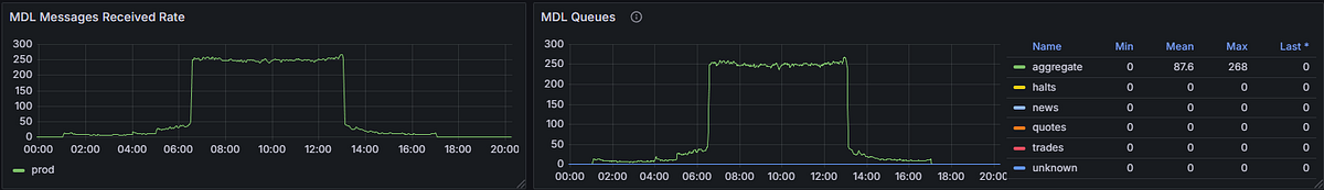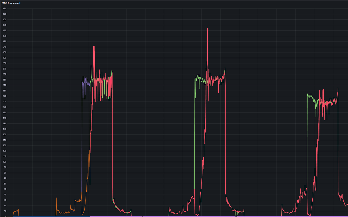 Sharp-eyed readers might’ve noticed something: I keep talking about 1,000+ events per second, but the dashboard screenshots show a max of 340 messages/second from the MDP. What gives?