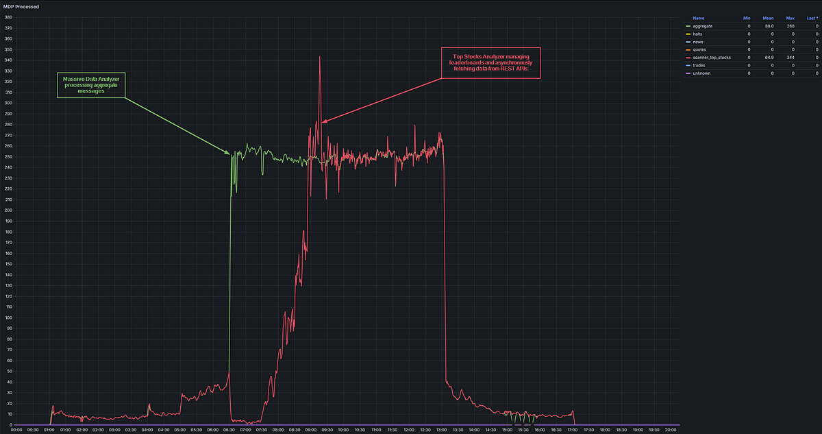 Here’s where the double-processing bit me: the Massive Data Analyzer was republishing everything from RabbitMQ to Redis, completely bypassing RabbitMQ’s graceful degradation. So when the Top Stocks Analyzer reset its cache right as the market opened, it got slammed with the full stampeding herd of accumulated messages. My elegant backpressure mechanism? Rendered completely ineffective by my own architecture.