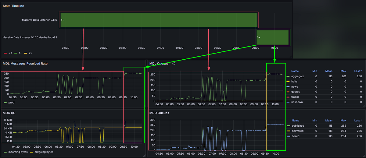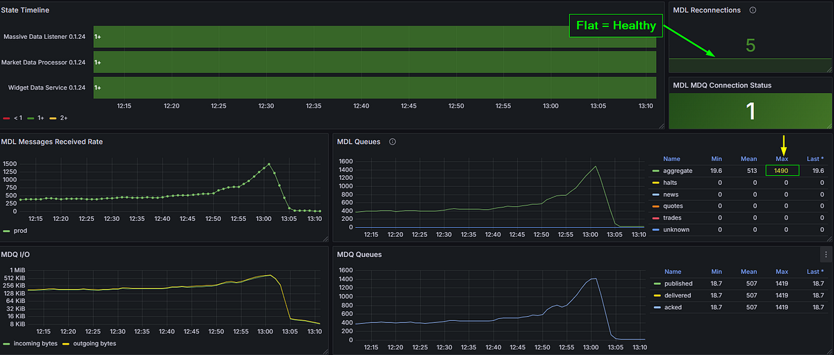 With the remaining feed — aggregates — running against real market conditions, the platform hit 1,490 msg/s at market close. That’s peak load, during one of the most volatile parts of the trading day, and the platform handled it without so much as a hiccup.