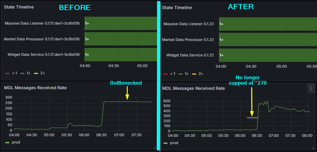 Then the monitoring told the story. The throughput graph had a flat top. Not a gradual degradation, not random drops — a clean ceiling at approximately 270 msg/s. That pattern is a dead giveaway. Something structural was capping throughput, and it had nothing to do with the network, the broker, or the upstream feed.