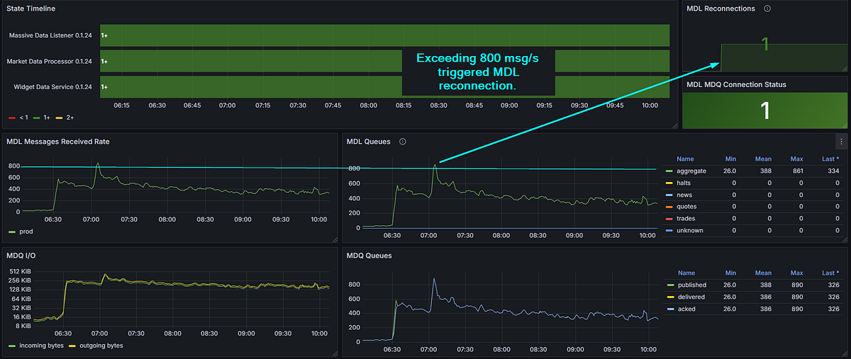 Below about 200 messages per second, everything was fine. Normal. Happy. But push the volume higher and the RabbitMQ publish pipeline would just freeze. Not crash — freeze. The MDL stayed connected upstream, happily receiving data from Massive. It just stopped publishing it anywhere useful.