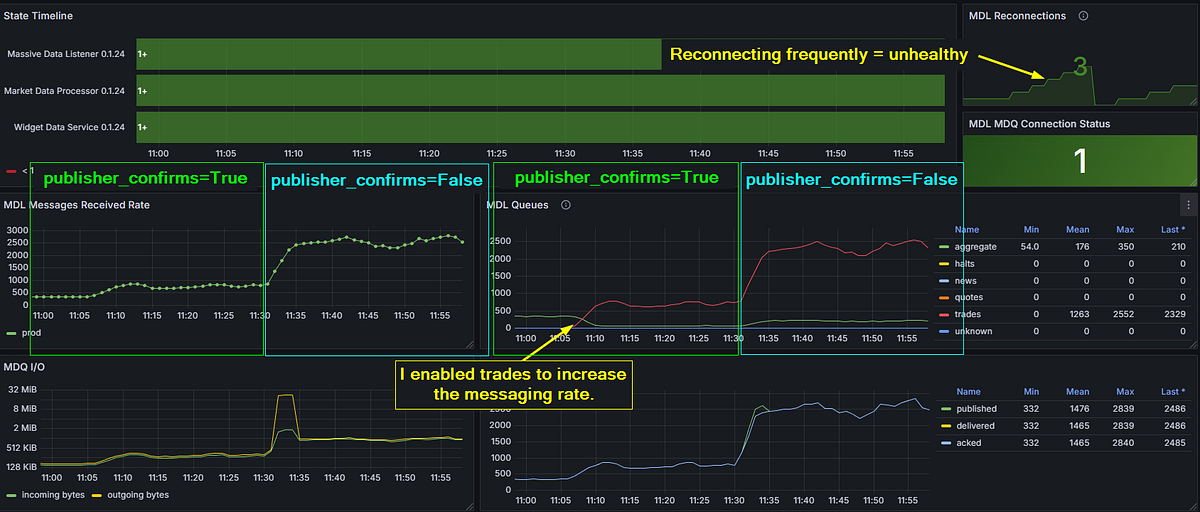 Layer 2: one transition from publisher_confirms=True to False, seen from two angles — received rate on the left, queue throughput on the right. Trades enabled to crank the volume. Fire-and-forget blows past 2,500 msg/s — but three reconnections and an unhealthy MDL say we found the next ceiling, not the final answer.